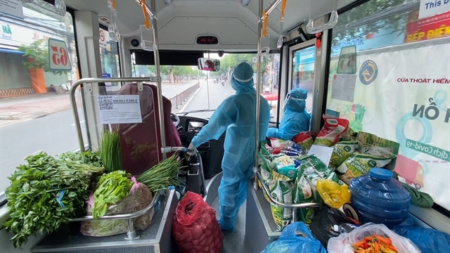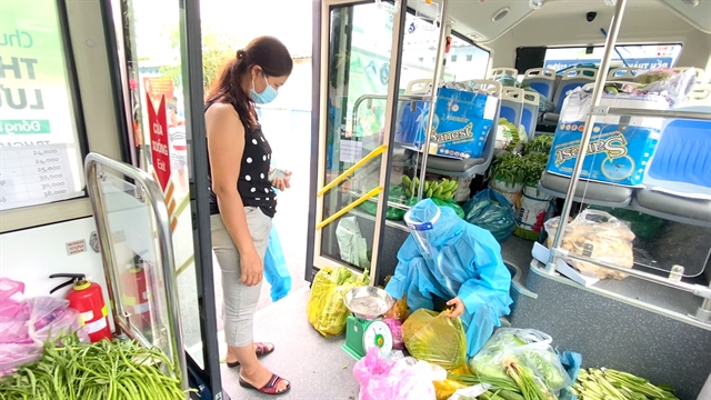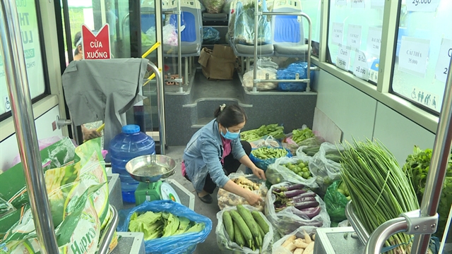 Bao Yen Construction Services Tourism Co’s five buses now travel around the city selling vegetables and other items, helping increase supply amid the closure of scores of traditional markets.