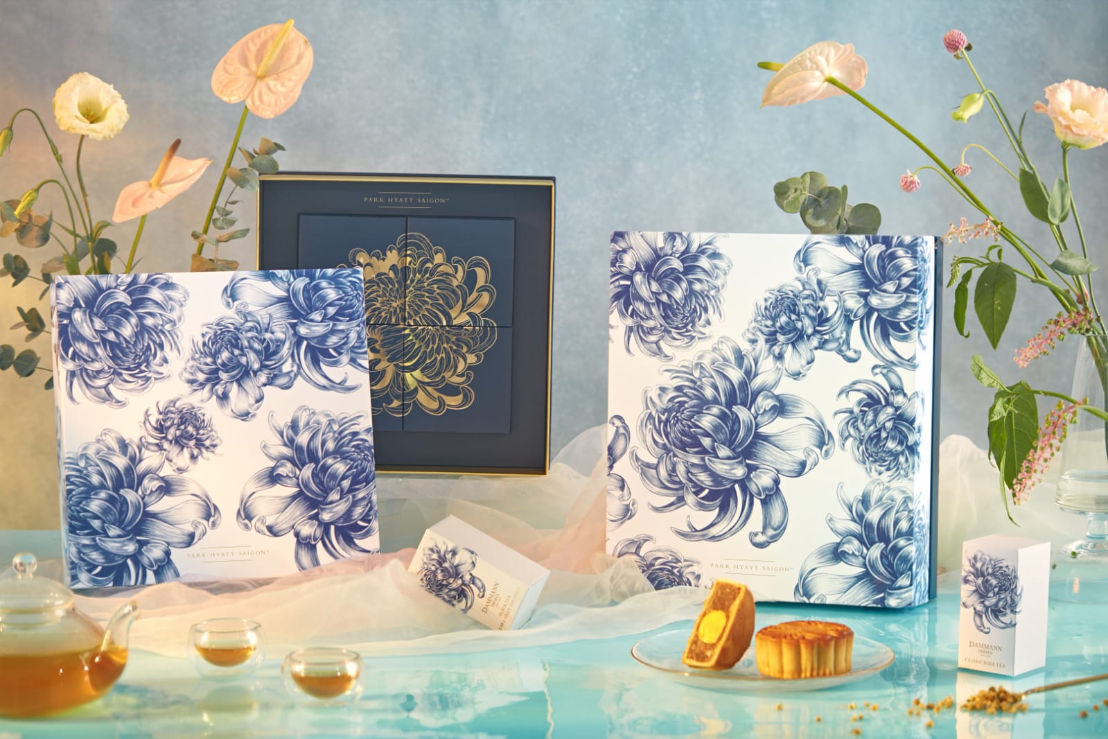 Titled Eternal Flora Blue, the mooncake collection is designed to focus on the Vietnamese culture and its beauty. Representing the beauty of Vietnamese traditional culture, delicate handcrafted porcelain is always a meaningful gift. As one of the Flowers of the Four Seasons, the vibrant but elegant chrysanthemums, which signify devoted love, contentment, optimism and cheerfulness in adversity, are the all-time favourite decorative themes of porcelain artists.