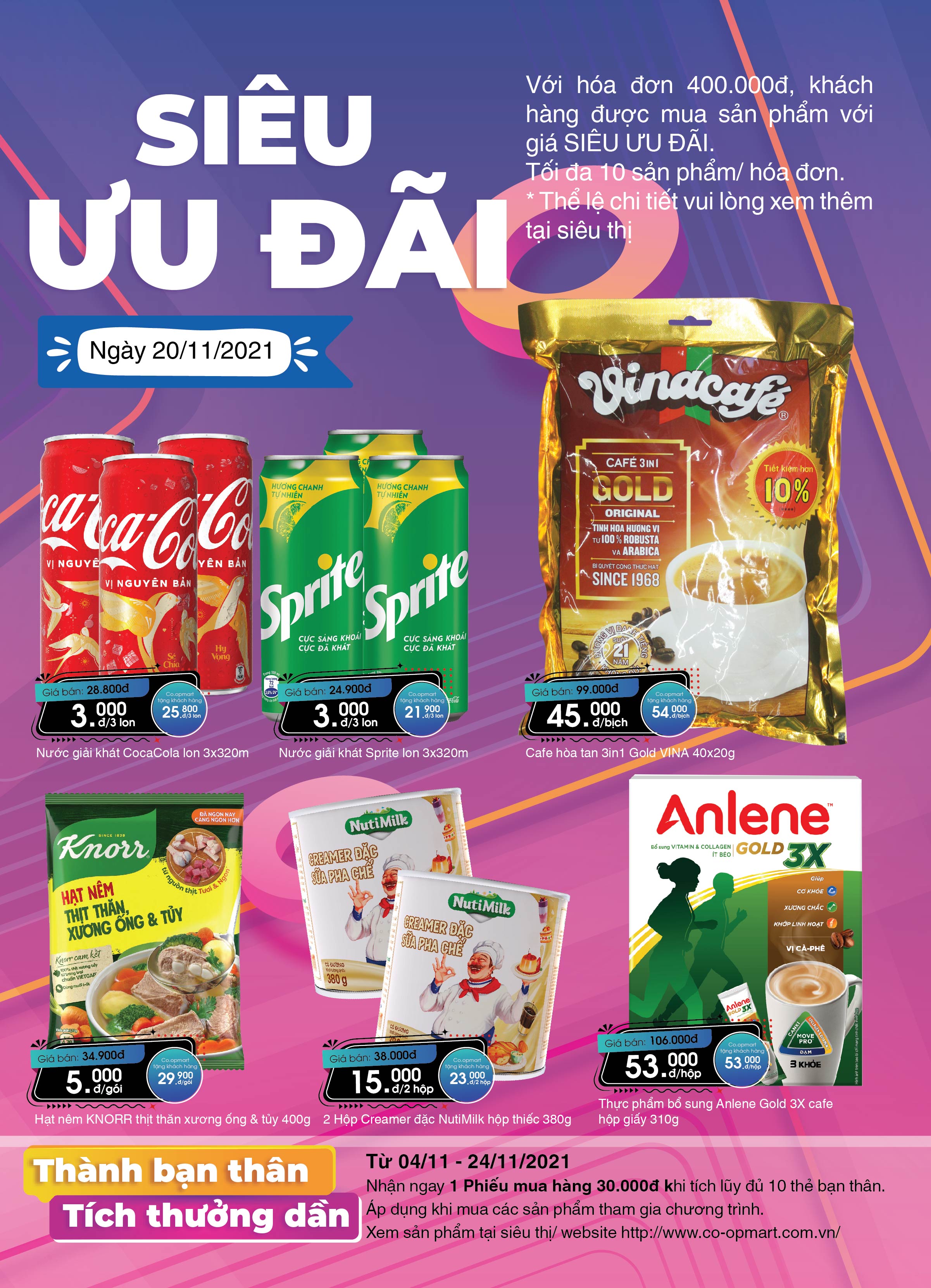 Three 320ml cans of Coca Cola/Sprite soft drinks will be sold for VND3,000, a 400gm pack of Knorr seasoning with filet meat and bone marrow extracts for VND5,000, two 380gm tin cans of NutiMilk condensed creamer for VND15,000, two 62.5g/L 2L bottles of Co.op Select fish sauce for VND69,000, a 5kg pack of Co.op Finest ST24 fragrant rice for VND107,000, a 3.8kg bottle of Lix perfumed laundry liquid for VND89,000, and a 3.6/4kg bottle of Lix green tea dishwashing liquid for VND49,000.