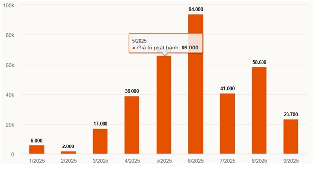 The real estate sector cooled significantly after months of accelerated issuance for debt refinancing. Only three property developers issued bonds in September, totalling less than VNĐ1.5 trillion, with interest rates ranging from 9.2 to 10.5 per cent annually.
