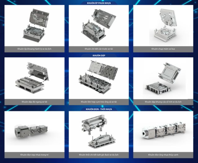 THACO INDUSTRIES produces various products, including plastic moulds, stamping moulds, blow moulds, extrusion moulds, and SMC moulds used in several sectors such as automotive, industrial, agriculture, and civil.