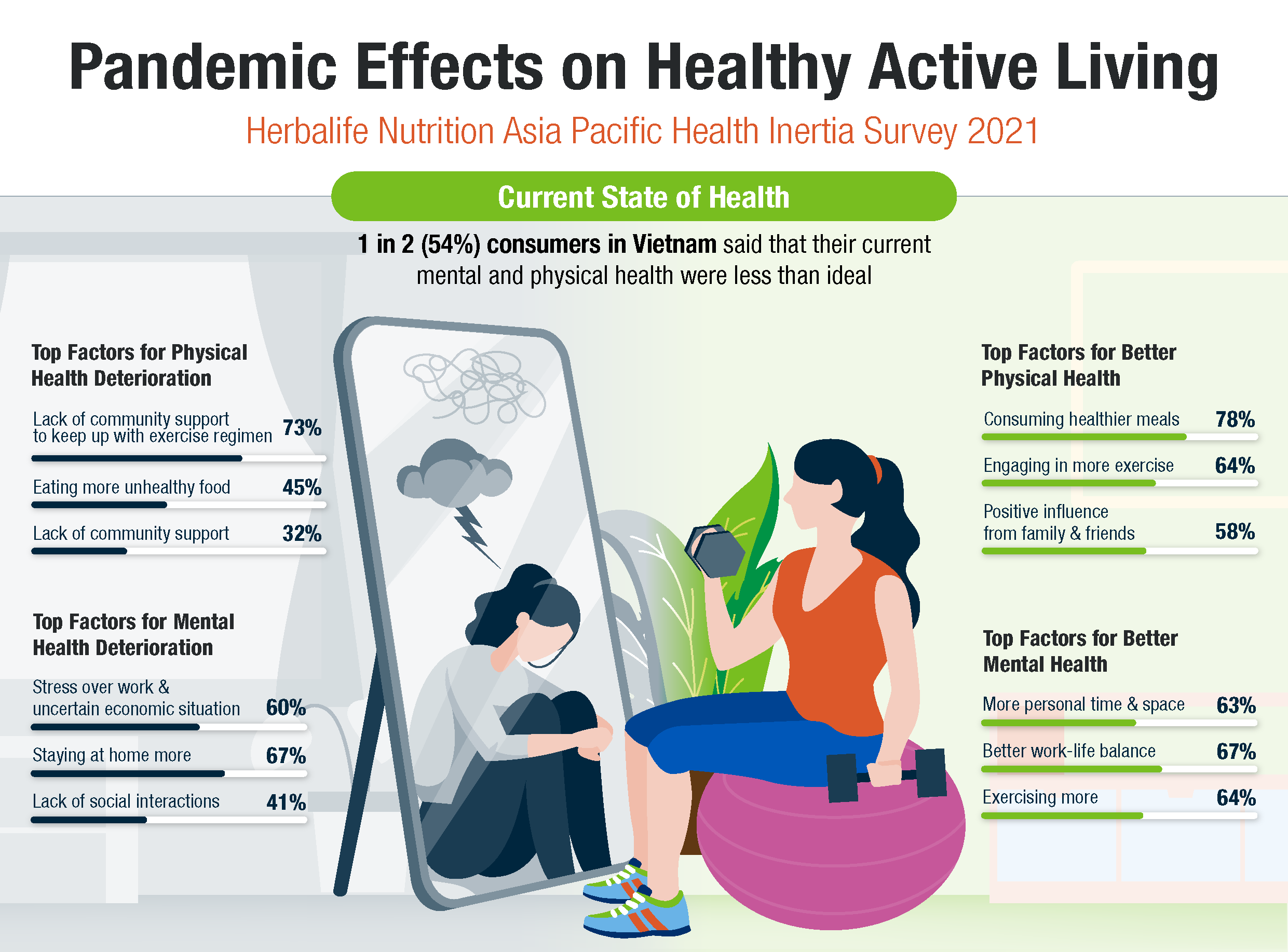 Conducted in July and August 2021, Herbalife Nutrition’s Asia Pacific Health Inertia Survey 2021 polled 5,496 consumers aged 18 and above in 11 Asia Pacific markets, including Viet Nam. The survey revealed insights into the impact of the pandemic on consumers’ health, as well as their attitudes and behaviours towards improving their well-being. — VNS