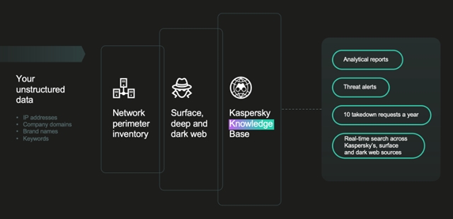 Using OSINT techniques combined with Kaspersky's knowledge base as well as analysis of the Surface, Deep, and Dark Web, the product provides a comprehensive picture of a business attack situation, including identifying vulnerabilities that can be exploited and alerting planned attacks by providing information about various types of threats such as network perimeter-related threats, dark web-related threats, malware-related threats and data leakages.