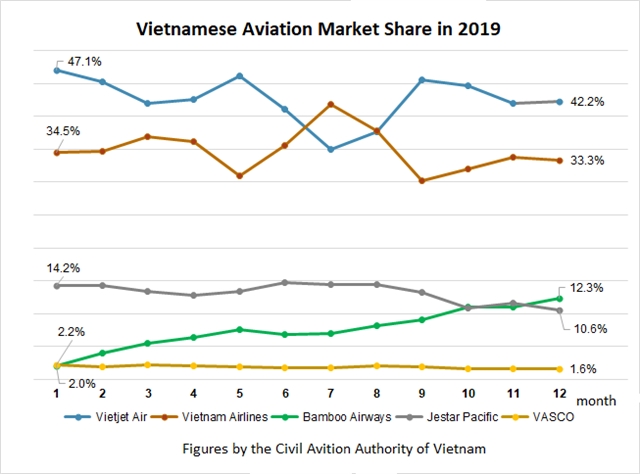 Vietnam Airlines saw a drop to 33.3 per cent in market share in December 2019, from approximately 34.5 per cent at the beginning of the year.
