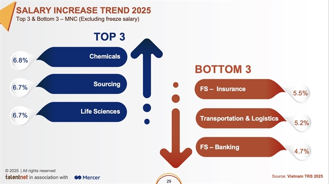 HCM CITY — Salary growth has slowed to its lowest pace in recent years, reflecting cautious spending and tighter global HR budgets, according to the 2025 Talentnet–Mercer Total Remuneration Survey.