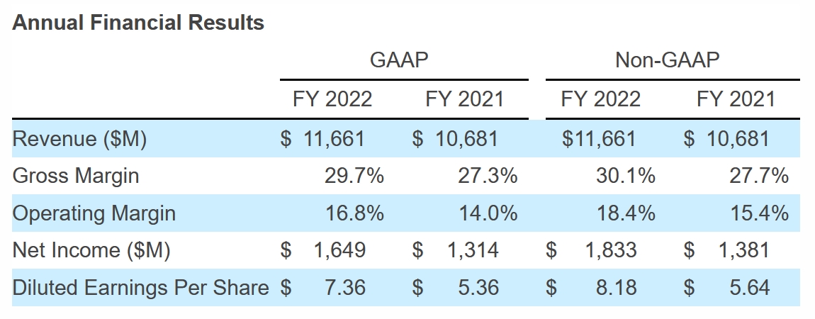 The company set its business outlook for the fiscal first quarter of 2023 with revenue of $2.5 billion, plus or minus $150 million and Non-GAAP diluted EPS of $1.40, plus or minus $0.20. — VNS