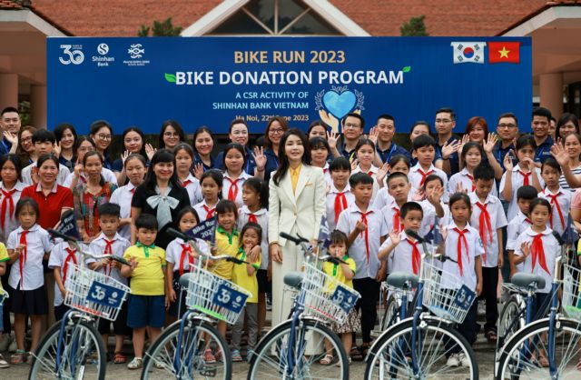 Shinhan Bank Vietnam donated 110 bicycles and gift boxes and gave away scholarships worth VND100 million (US$4,250) to underprivileged students at the SOS Children Village during its “Bike Run” event in Ha Noi on June 22 in the presence of the Korean First Lady Kim Keon Hee.