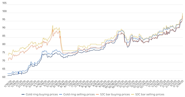 Gold rings are also seeing strong growth, quoted at VNĐ97.7 million per tael for sellers and VNĐ99.7 million for buyers. Ring prices also hit VNĐ100 million per tael earlier in the session.