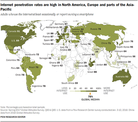 Fact-tank PEW’s newest research says while the gap in internet usage between emerging and advanced economies is narrowing, there are still large swaths of the world where significant numbers of citizens do not use the internet.