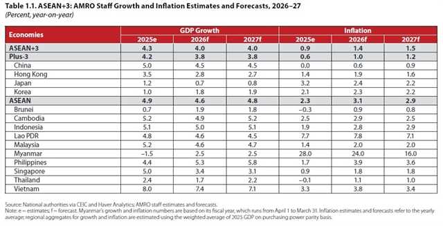 Across the broader ASEAN+3 region, growth is projected at 4.0 per cent in both 2026 and 2027, following stronger-than-expected expansion of 4.3 per cent in 2025. Inflation is forecast to rise modestly from 0.9 per cent in 2025 to 1.4 per cent in 2026 and 1.5 per cent in 2027.