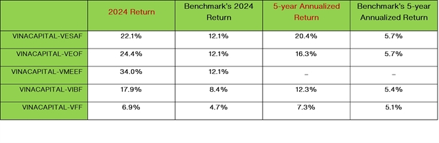 VinaCapital Fund Management Joint Stock Company has announced that its mutual funds finished 2024 on a high note, with VINACAPITAL-VMEEF being the top performer.