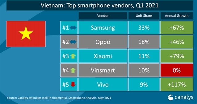 The company’s sales, including the two brands of Xiaomi and POCO, in the first quarter in the Vietnamese market accounted for 10.77 per cent of the total in the market.